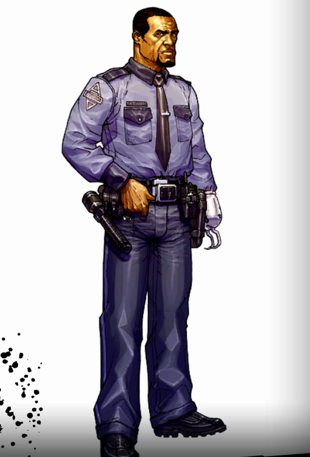 Cash étant un agent de l'asile d'Arkham porte une tenue de garde traditionnelle. Il porte une chemise bleu avec les écussons de l'asile, une cravate noire, un pantalon bleu foncé ainsi que des chaussures noires de service.