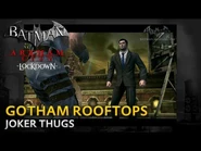Batman affronte les hommes de main du Joker sur le Gotham rooftops avant de combattre le Clown prince du crime qui commençait tout juste à lancer des explosifs dans le bâtiment adjaçant avant que Batman ne le batte.